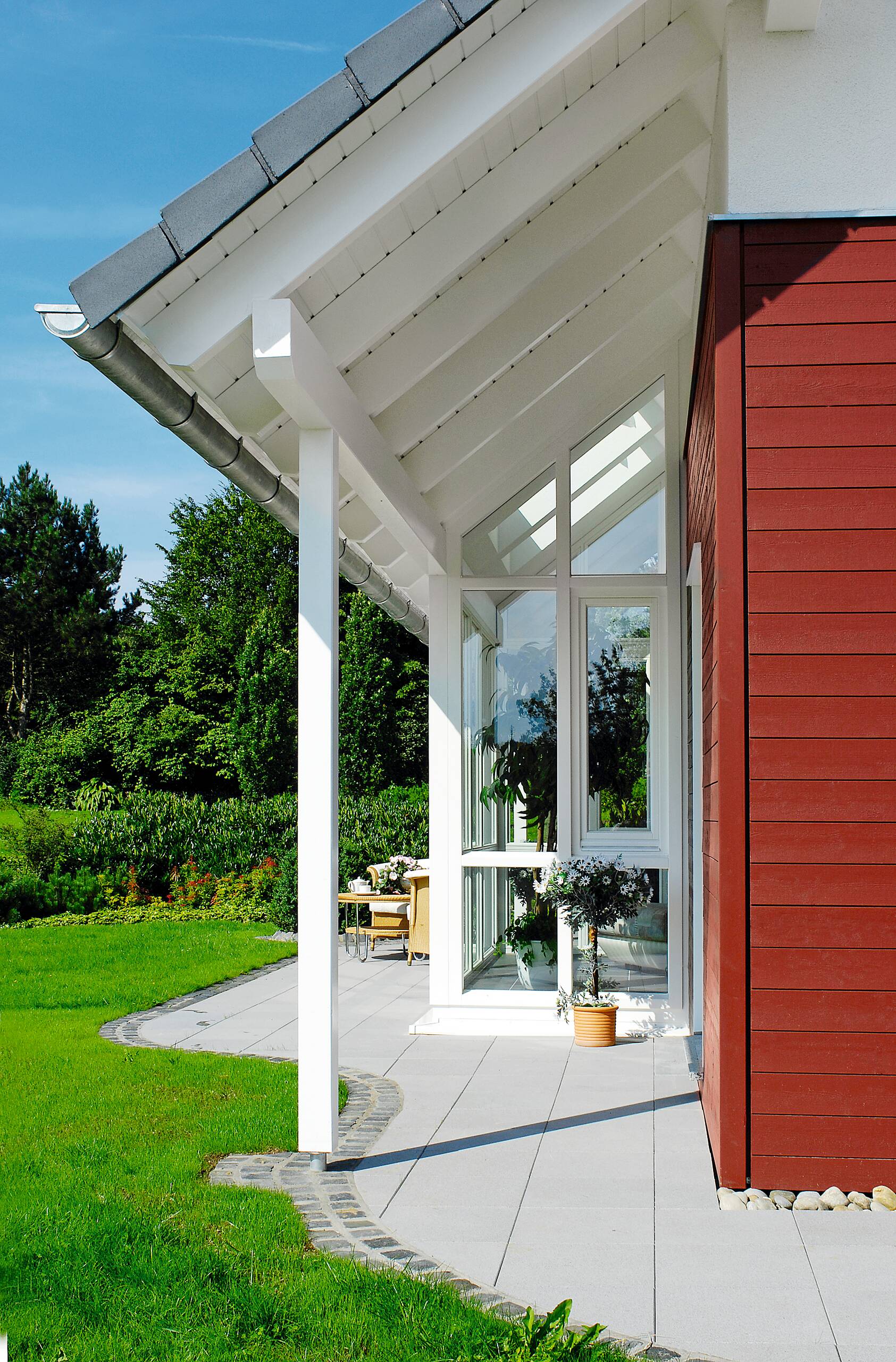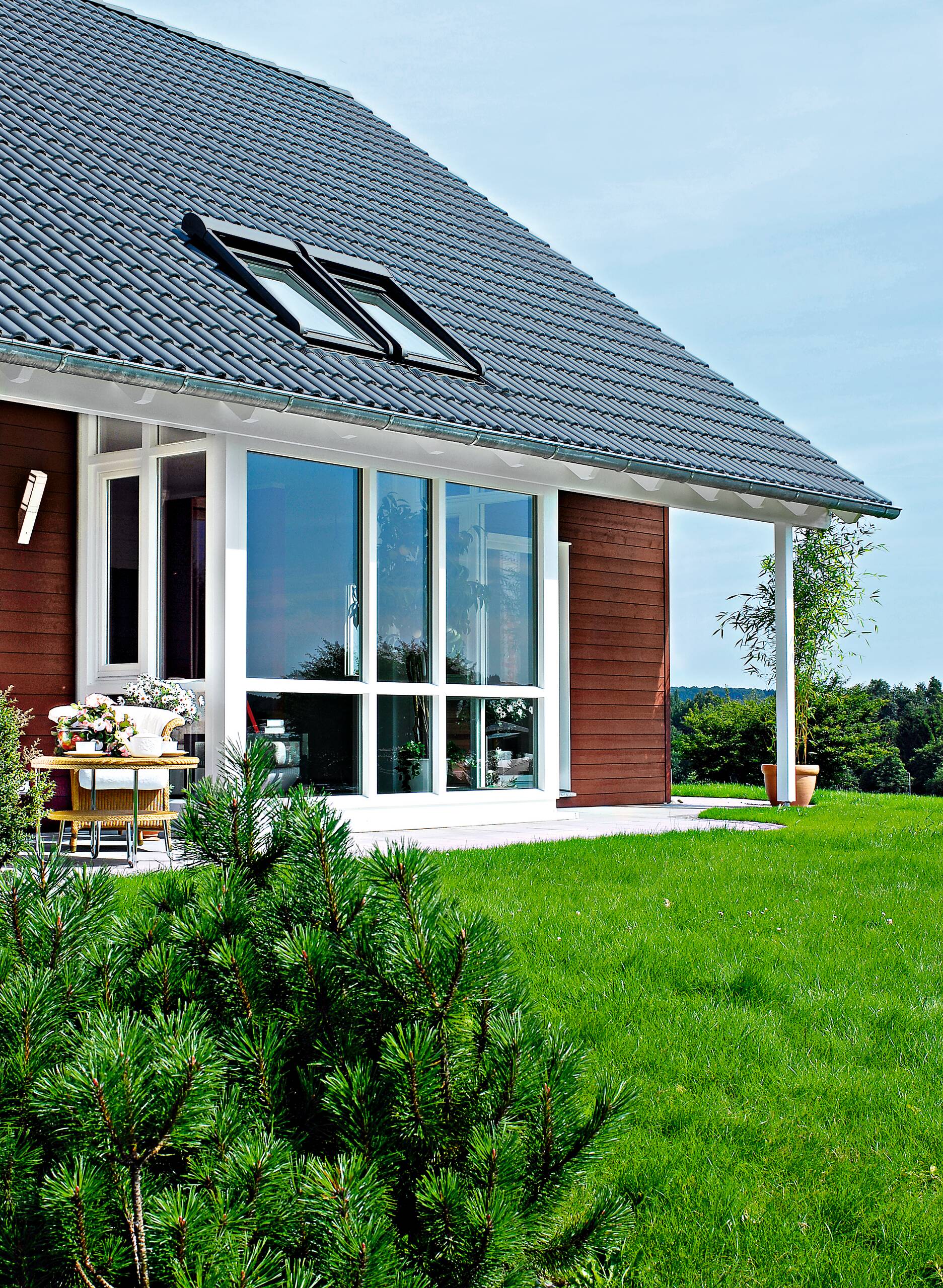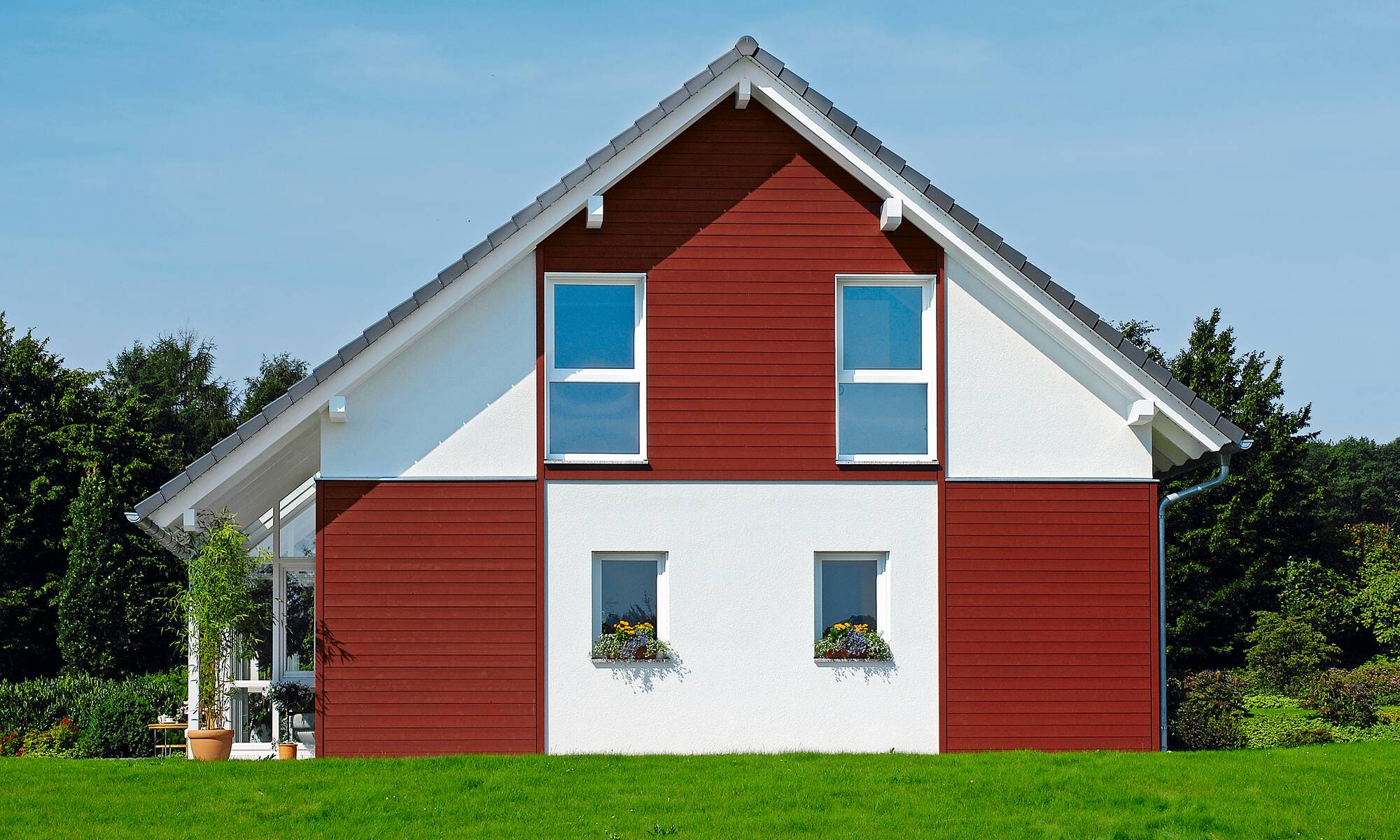 Le caractère unique de cette maison WeberHaus réside dans la multitude de variantes de finition de la façade. L'habillage bois, p. ex. dans la teinte rouille, contraste merveilleusement avec le crépi blanc qui attire l'oeil. Mais ce ne sont pas uniquement l'aménagement extérieur ni l'architecture, avec deux terrasses couvertes et un jardin d'hiver central, disponible en option, qui vous séduiront. Mais aussi, en découvrant, une fois à l'intérieur, qu'elle dispose de plus d'espace qu'on ne l'imagine de l'extérieur.