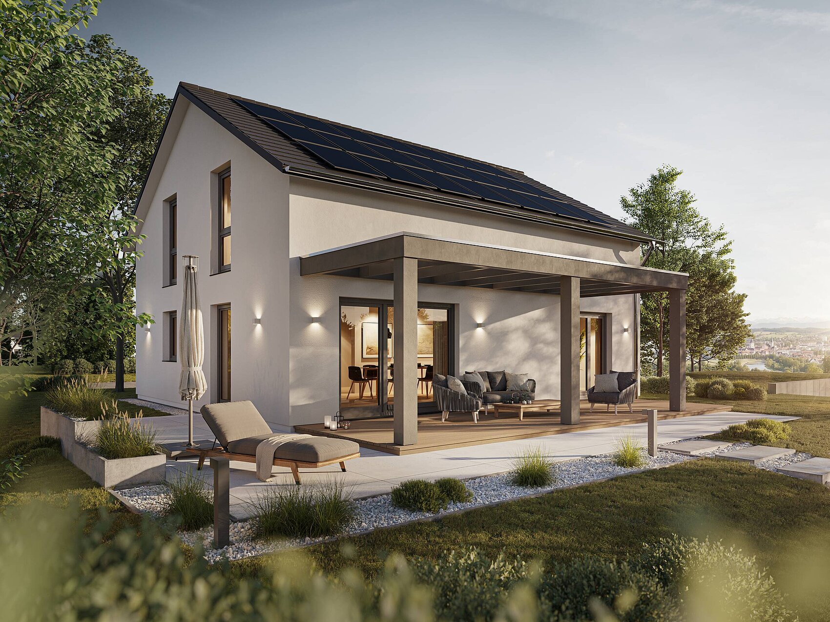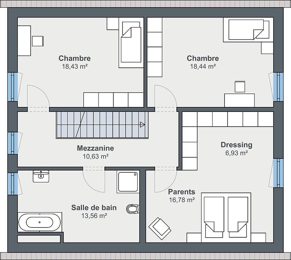 La maison promotionnelle Balance séduit par son style classique avec son toit à deux pans et ses murs de combles de 140 cm. Avec son espace de vie d’environ 160 m², elle offre un concept d’habitat harmonieux avec beaucoup d’espace pour la famille, le travail et les loisirs. L’architecture équilibrée allie des éléments traditionnels à un aménagement moderne de l’espace. Des pièces lumineuses et des structures claires garantissent un confort de vie agréable. Grâce à son prix promotionnel attractif, cette maison est la solution idéale pour les maîtres d’ouvrage qui accordent de l’importance à l’espace, à la qualité et à la sécurité de planification.