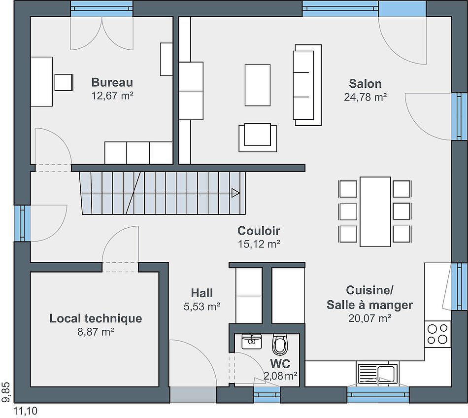 9,85 x 11,10 m