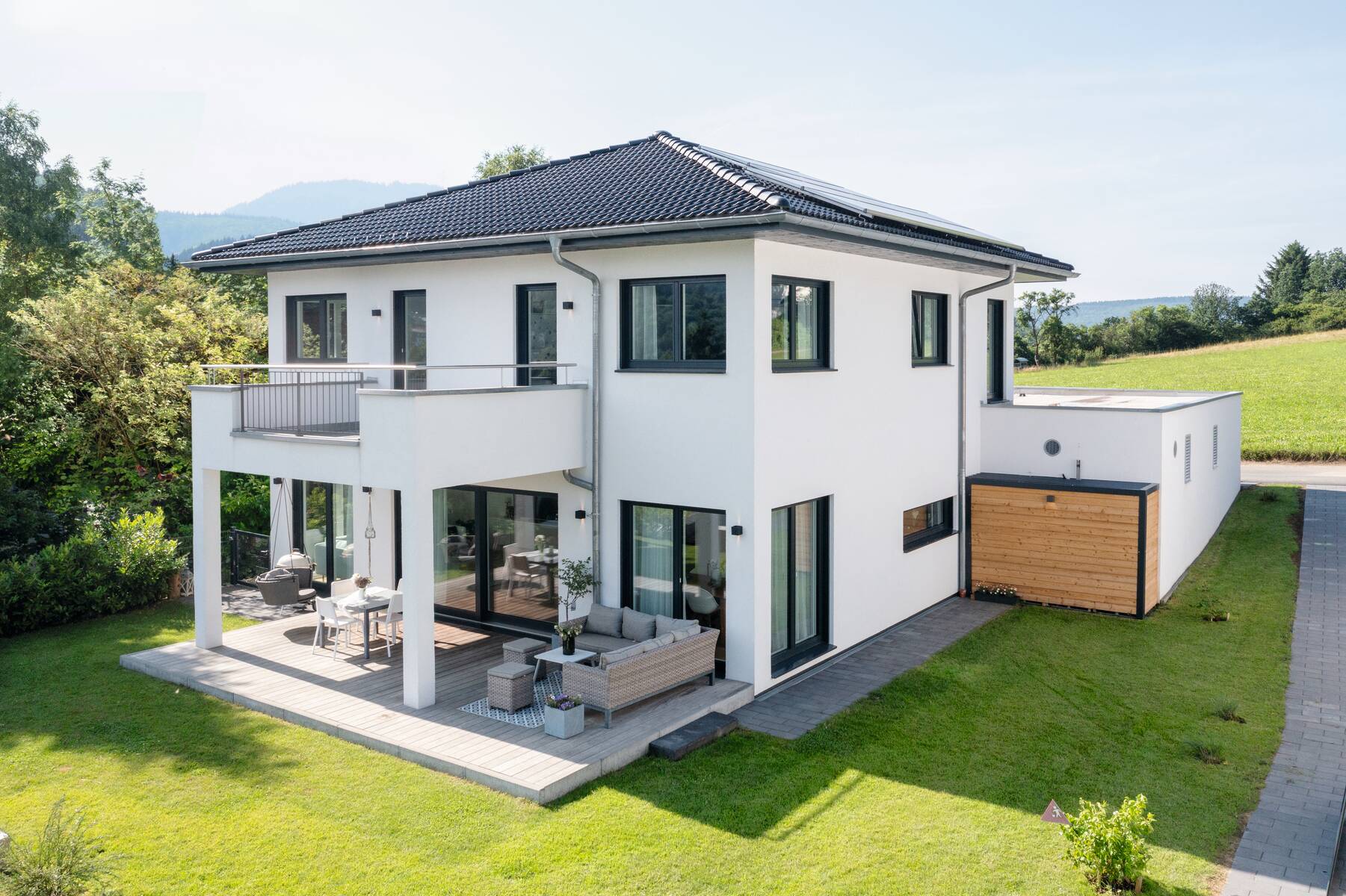 Villa urbaine de près de 150 mètres carrés de surface habitable avec toit en pavillon basée sur la série CityLife. Un garage avec accès direct à la maison est attenant à cette maison unifamiliale sur deux étages. C‘est là que se trouve le système picea de HPS Home Power Solution, qui fait partie du projet pilote de technologie énergétique innovant utilisée dans cette maison Il s'agit d'un appareil compact permettant une alimentation en énergie autonome tout au long de l'année. L'installation de stockage transforme en hydrogène l'électricité qui n'est pas utilisée immédiatement.
