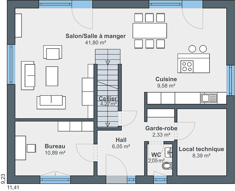 Cette maison individuelle propose des solutions bien pensées pour un confort de vie à chaque étape de la vie. Ses lignes épurées allient une architecture intemporelle à une construction durable, idéale pour les maîtres d’ouvrage tournés vers l’avenir. De grandes fenêtres garantissent des pièces baignées de lumière et un confort de vie agréable. Grâce à son prix promotionnel attractif, la construction durable avec WeberHaus devient particulièrement économique. Une maison individuelle qui combine confort, respect de l’environnement et qualité.