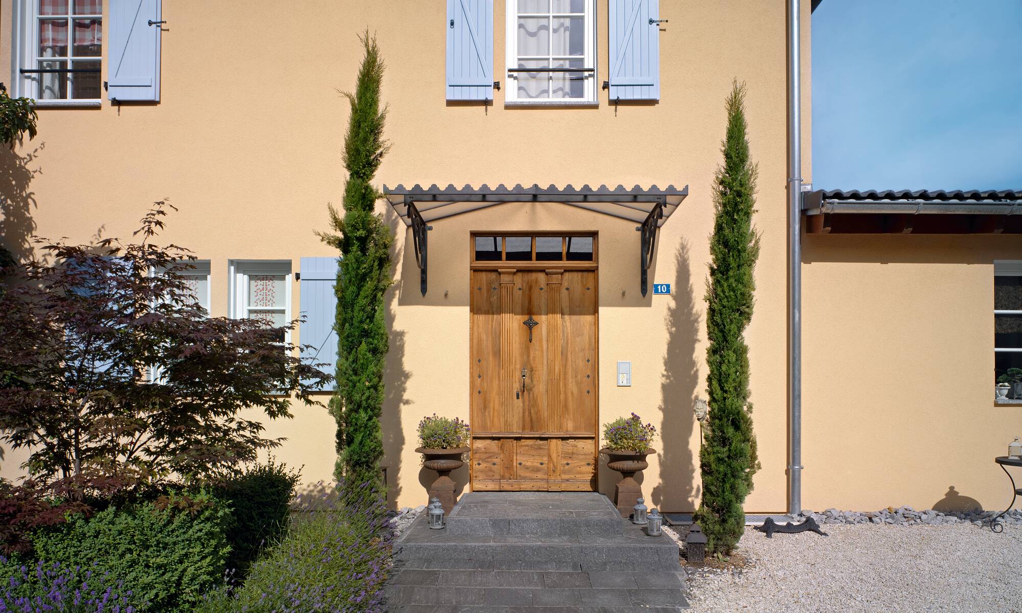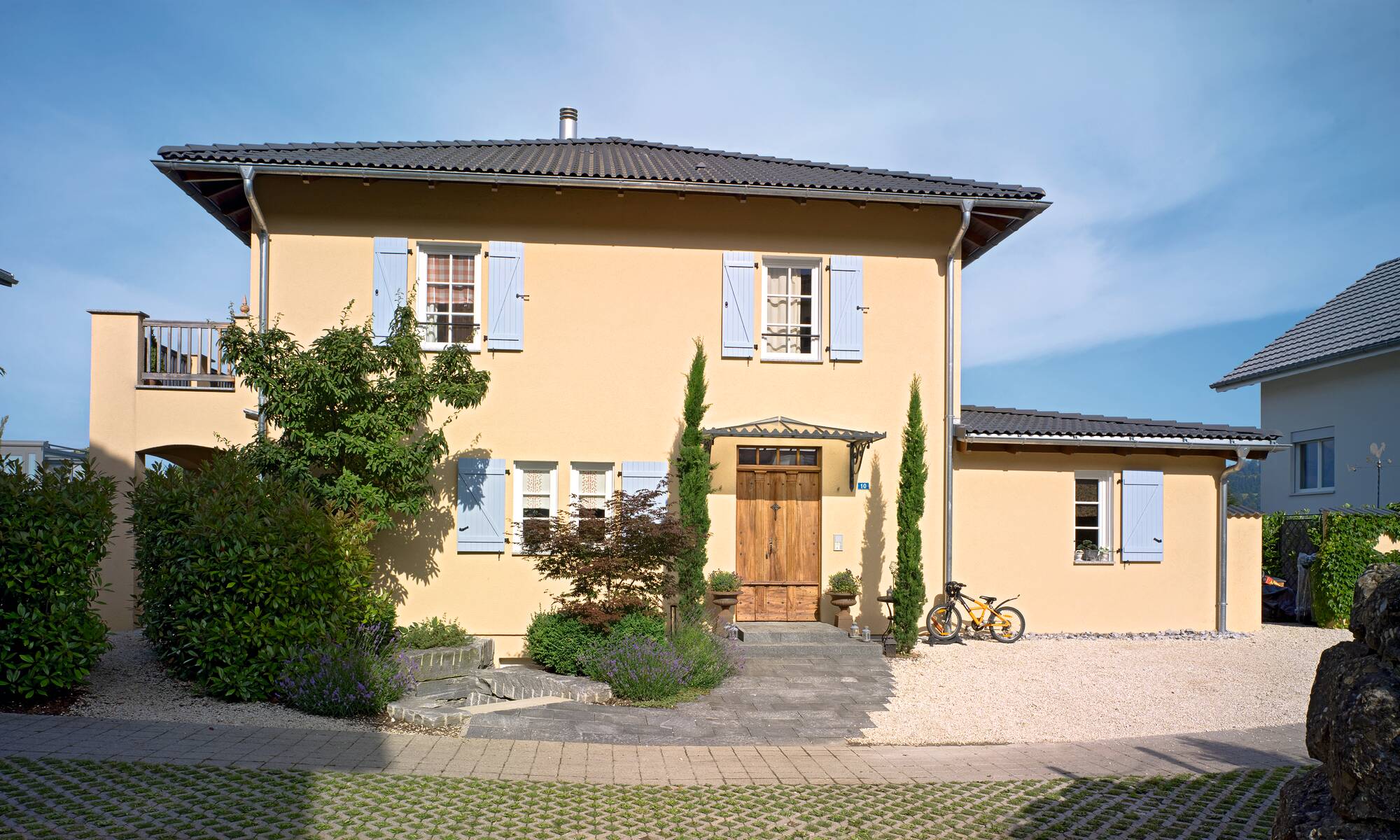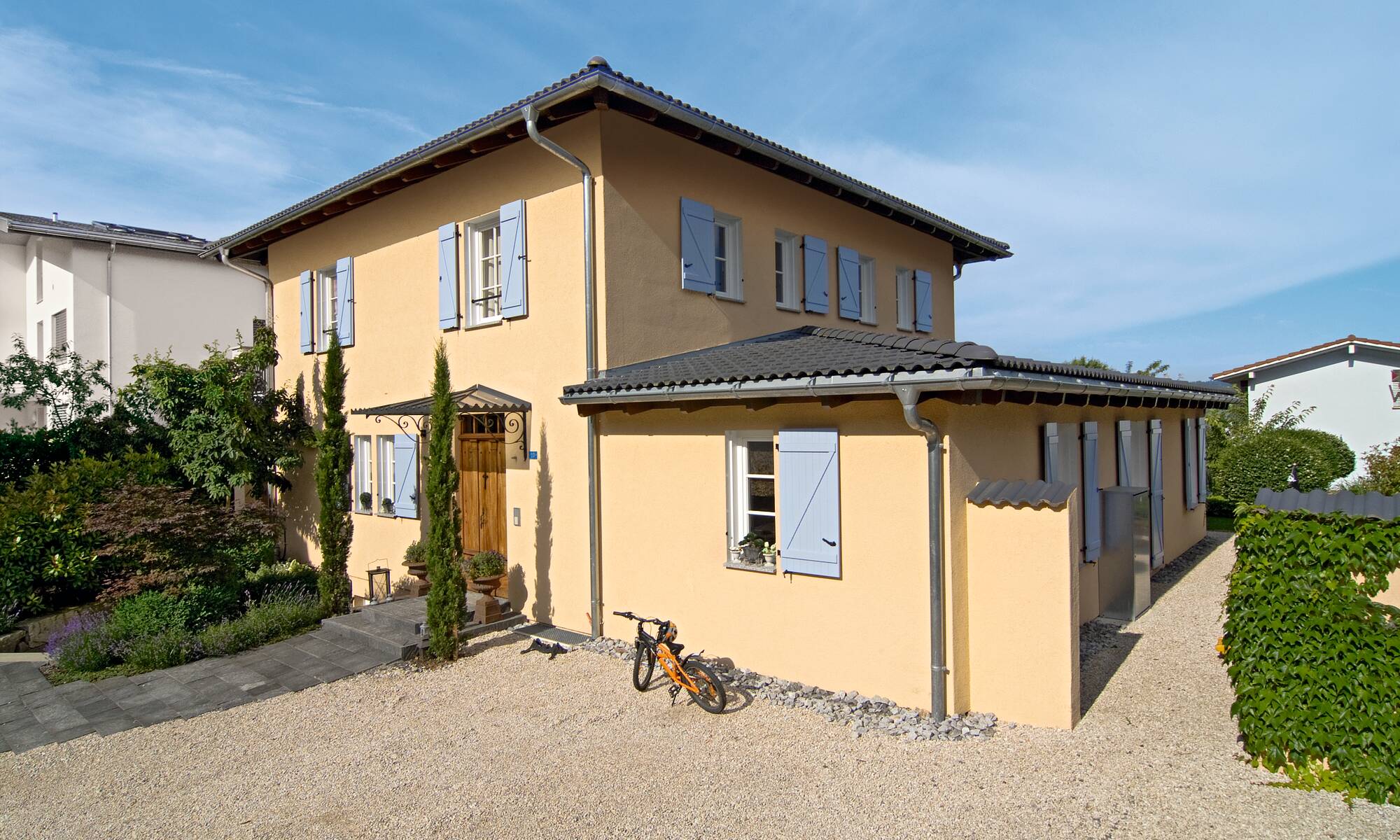 Cette maison rappelle sans conteste des vacances dans le sud. Inspiré de l'architecture des maisons de campagne du bassin méditerranéen, cet objet s'insère harmonieusement aussi bien dans un milieu rural que dans un quartier résidentiel urbain. La pièce maîtresse du design est la combinaison chromique entre un enduit couleur sable et des volets bleu clair. Le grand balcon et les arcades renforcent le romantisme rural que l'on retrouve également à l'intérieur – sans être excessif ni trop rustique.