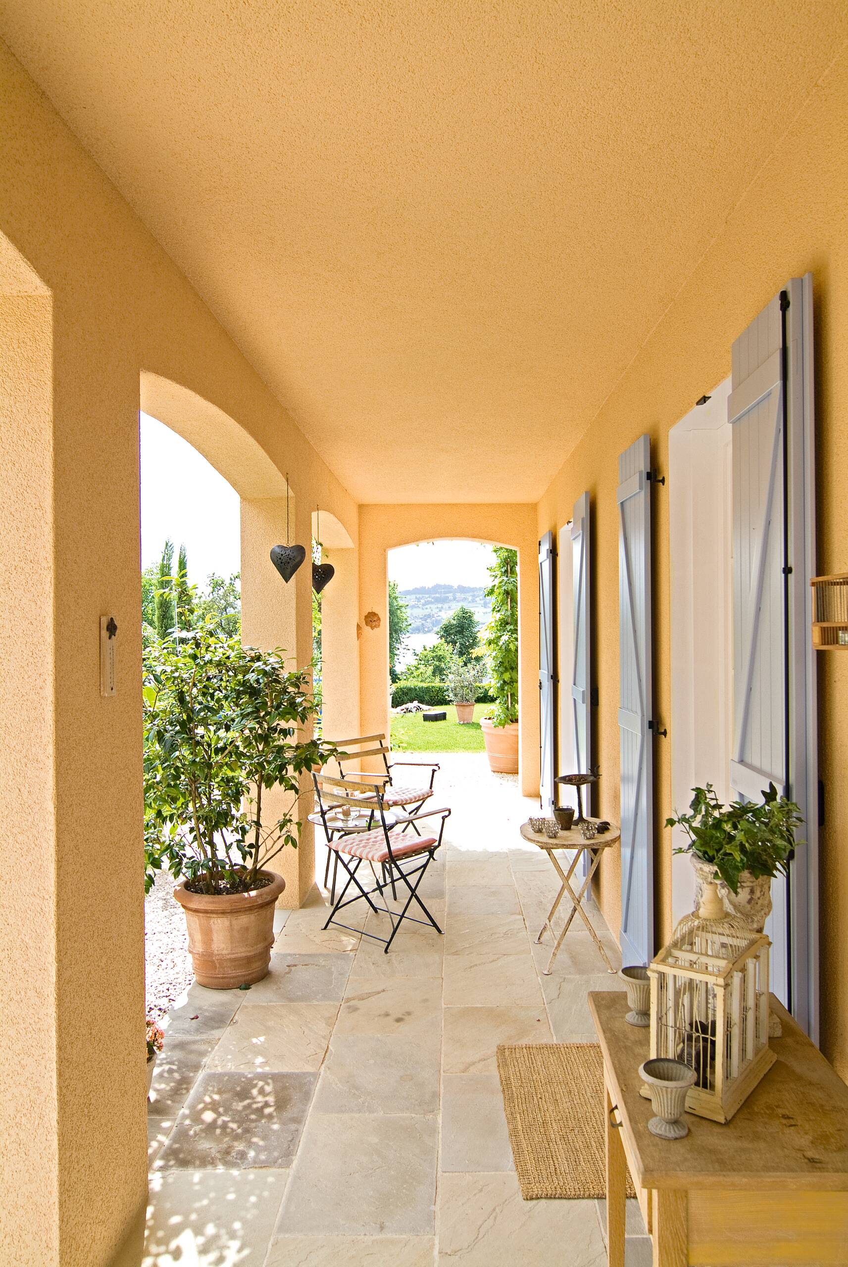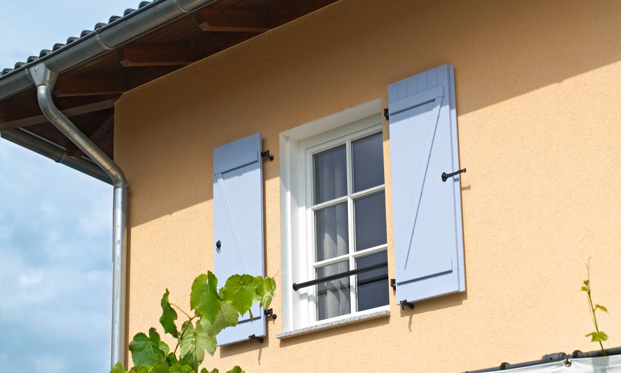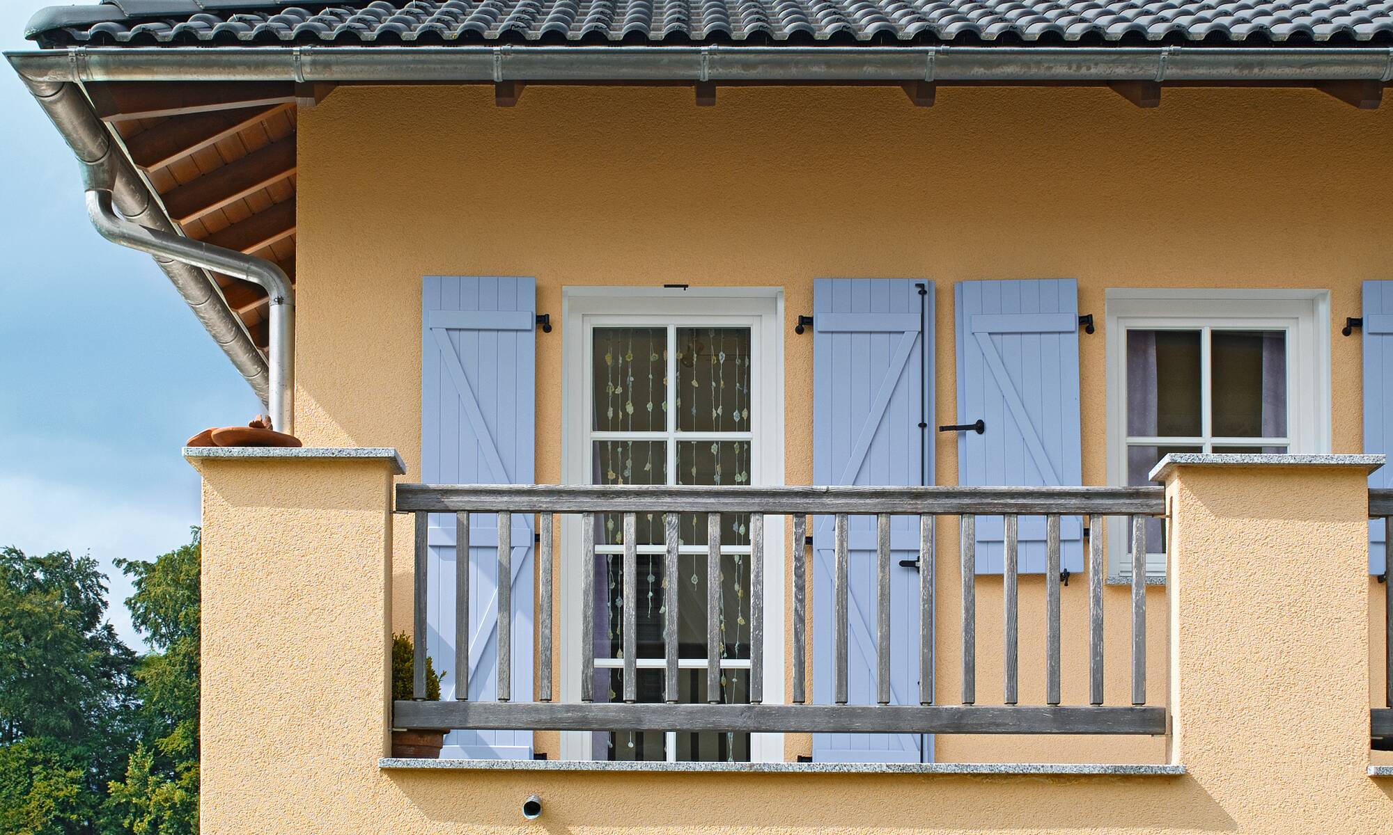 Cette maison rappelle sans conteste des vacances dans le sud. Inspiré de l'architecture des maisons de campagne du bassin méditerranéen, cet objet s'insère harmonieusement aussi bien dans un milieu rural que dans un quartier résidentiel urbain. La pièce maîtresse du design est la combinaison chromique entre un enduit couleur sable et des volets bleu clair. Le grand balcon et les arcades renforcent le romantisme rural que l'on retrouve également à l'intérieur – sans être excessif ni trop rustique.