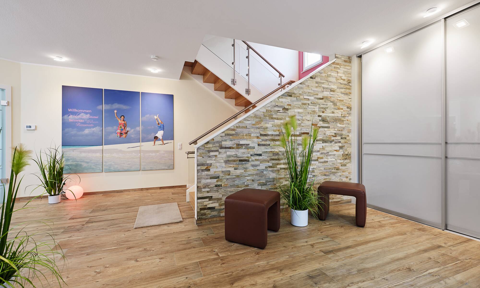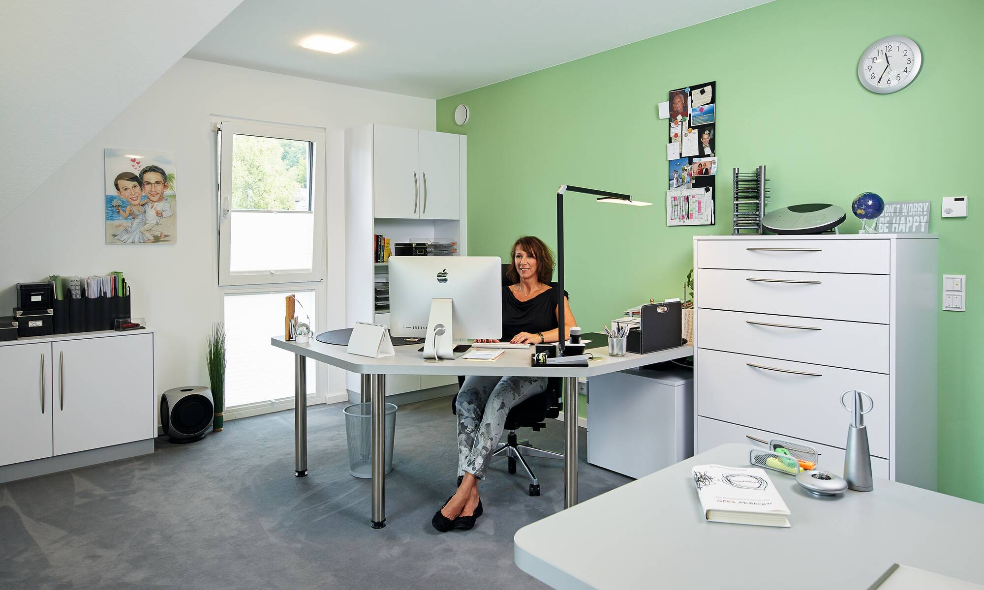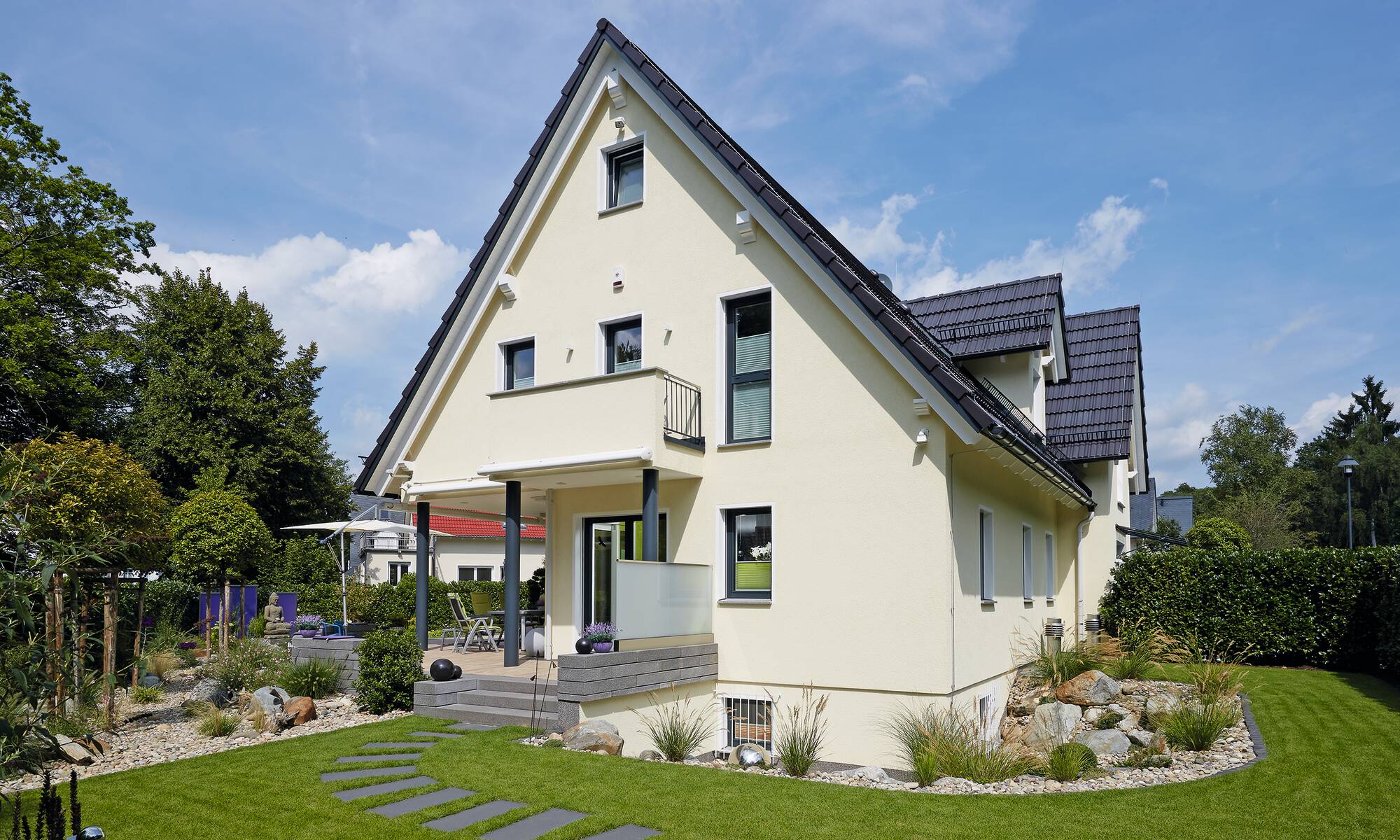 Cette maison d’architecte représente pour ses propriétaires une véritable oasis de bien-être. Ses caractéristiques : trois pignons, deux balcons, un garage et une cave aménagée en logement. Un toit en pente raide, un crépi décliné en jaune pâle, des encadrements de fenêtres et des tuiles gris anthracite confèrent à la maison un aspect moderne.