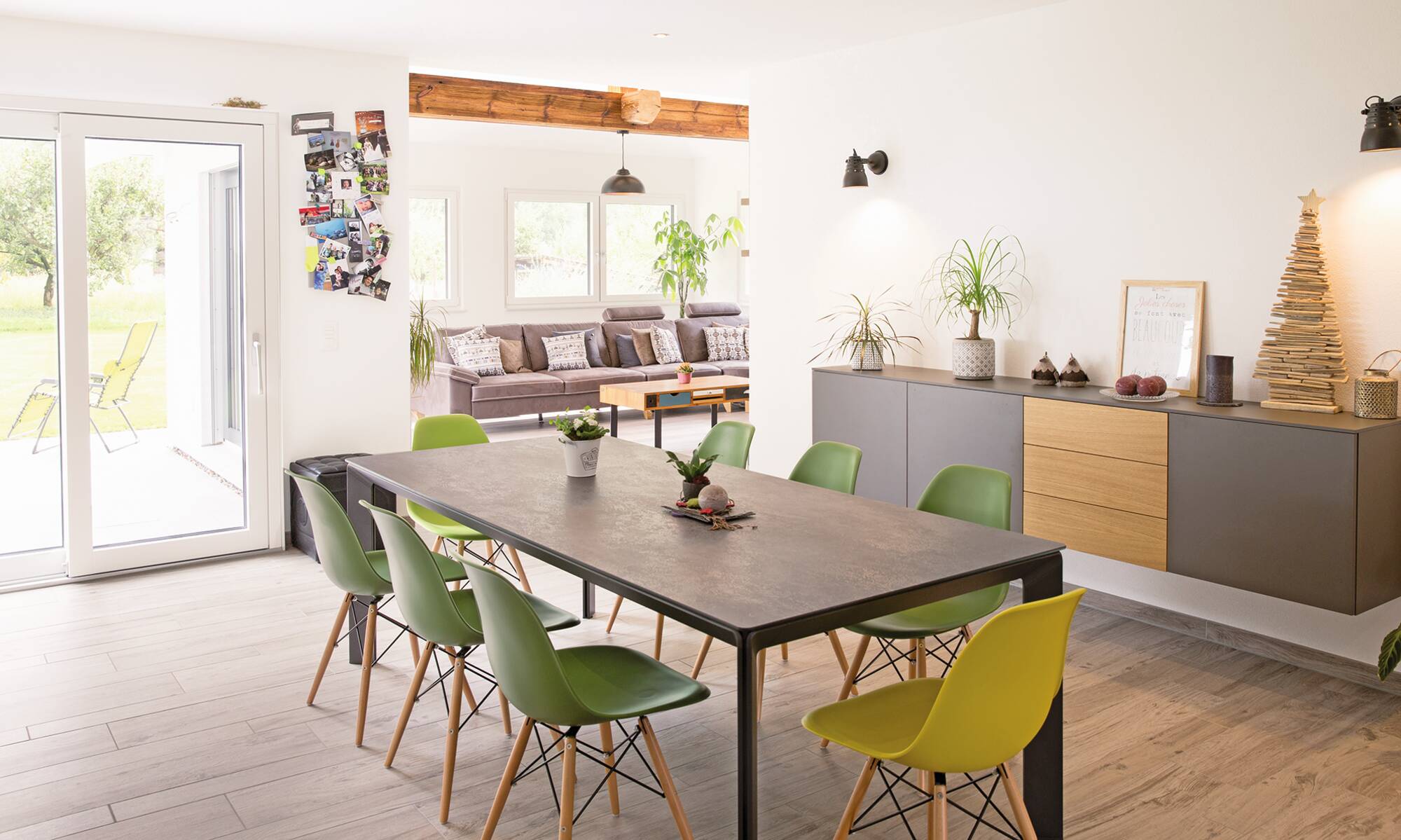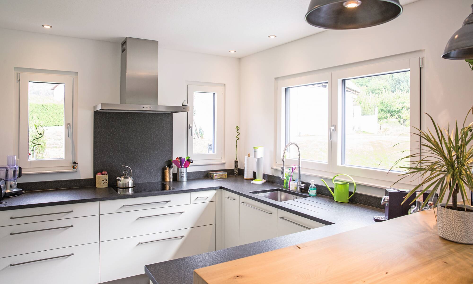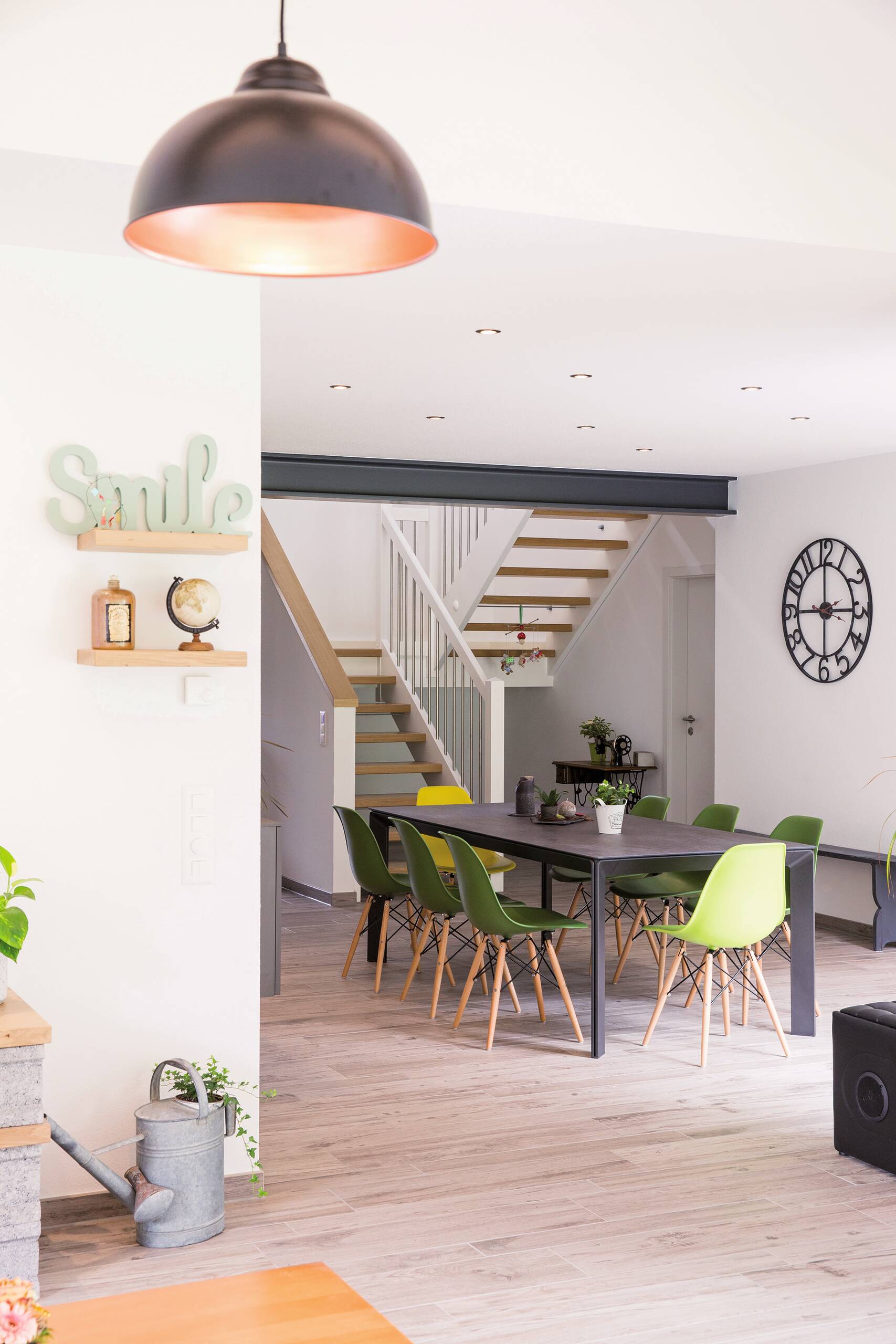 La maison d’architecte à toit en croupe est pour les propriétaires la villa de leurs rêves dans laquelle ils se sentent bien. "Si nous devions déménager un jour, nous demanderions immédiatement à WeberHaus de nous reconstruire la même maison", dit le père de famille d’emblée. La maison compte env. 200 m2 de surface habitable répartis sur deux étages pleine hauteur.