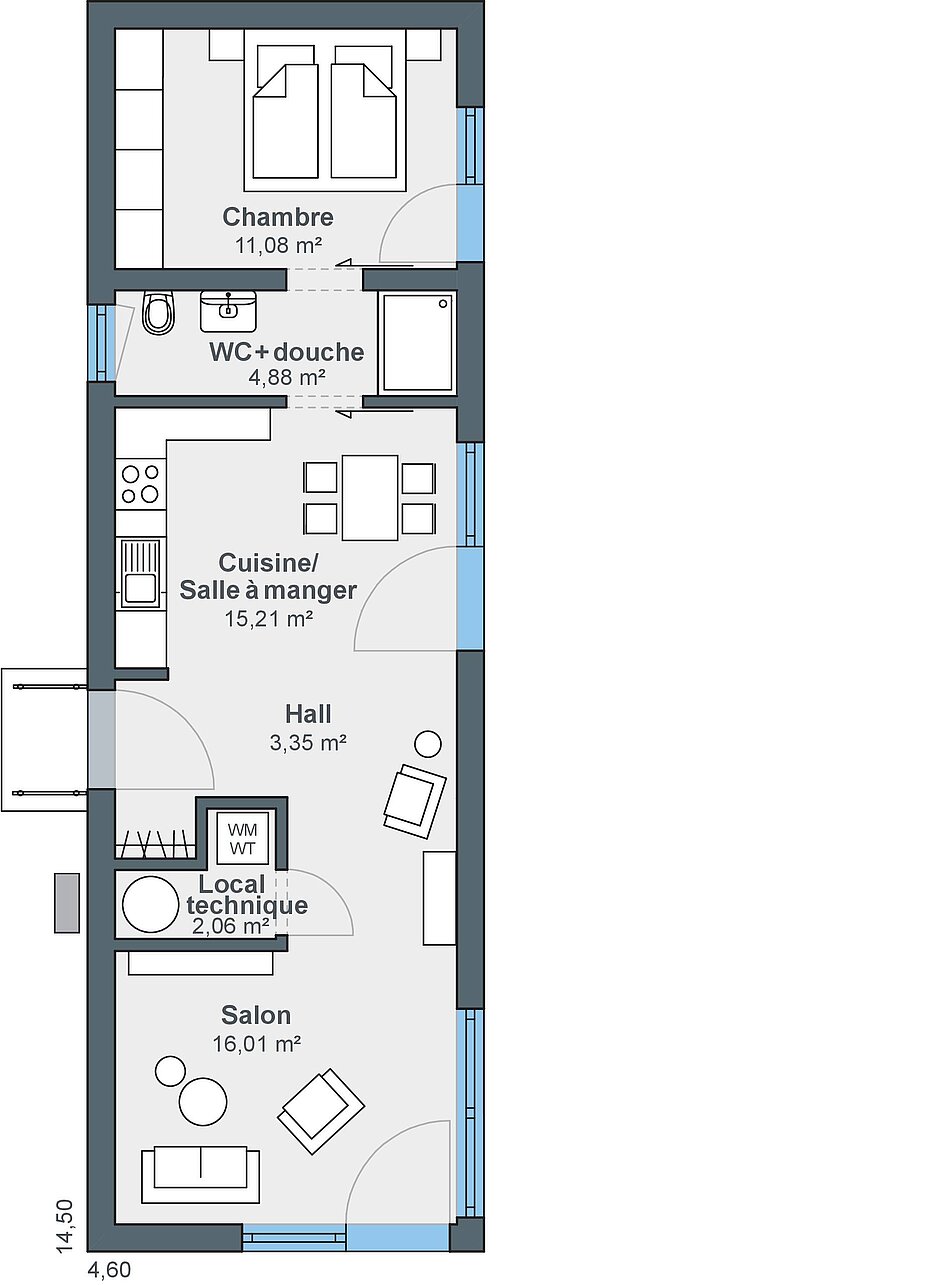 Le bungalow de la série OPTION séduit par sa longueur imposante de 14,50 mètres et sa surface habitable d’environ 55 m2 – parfait pour les personnes qui souhaitent se concentrer sur l’essentiel. Avec son toit plat et sa façade en crépi blanc, il rappelle le style Bauhaus : sobre, fonctionnel et moderne. La façade avant se présente volontairement de manière discrète, tandis qu’à l’arrière, de généreux éléments de fenêtre laissent entrer beaucoup de lumière naturelle à l’intérieur de la maison. Pour un aspect plus chaleureux, il est possible de choisir le bungalow avec un bardage en bois.