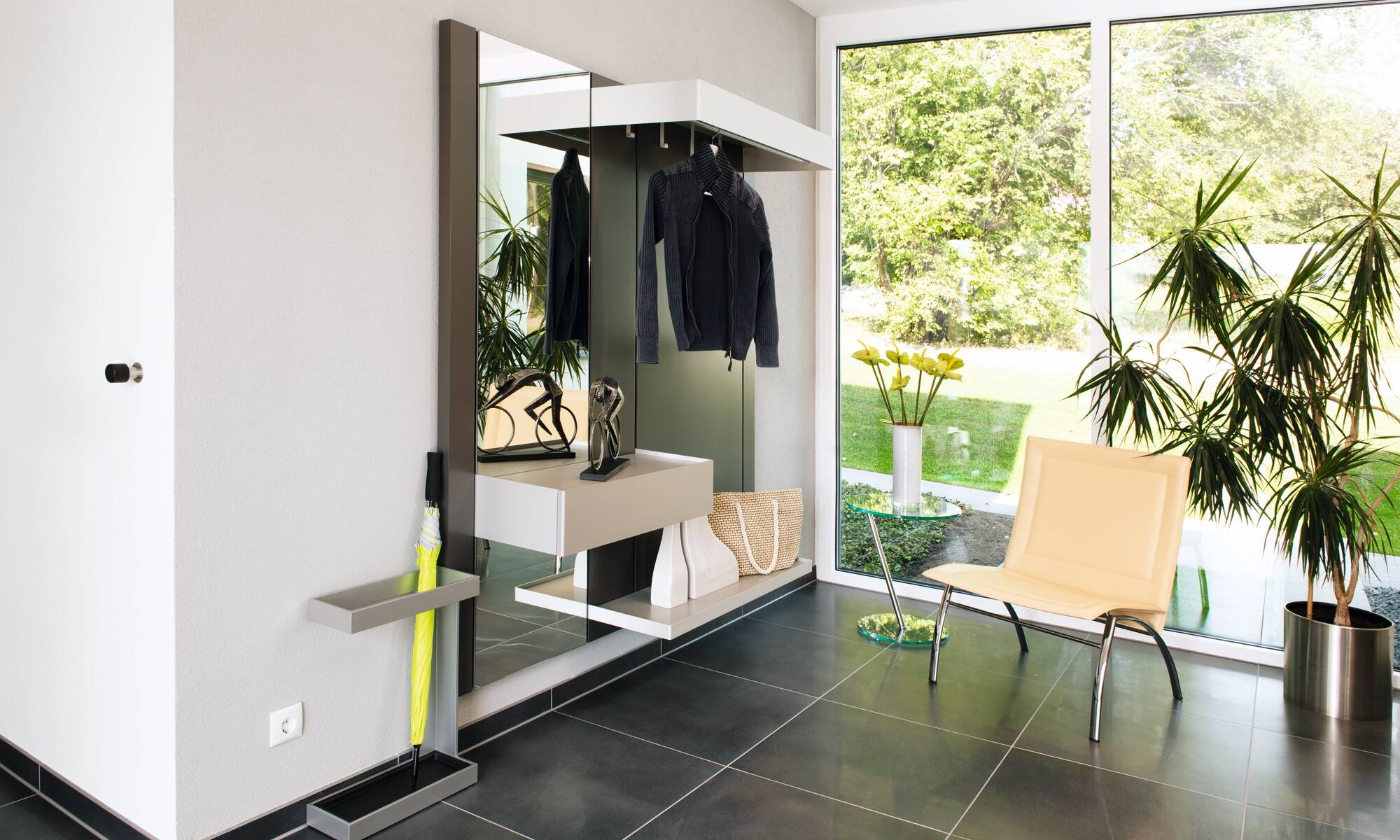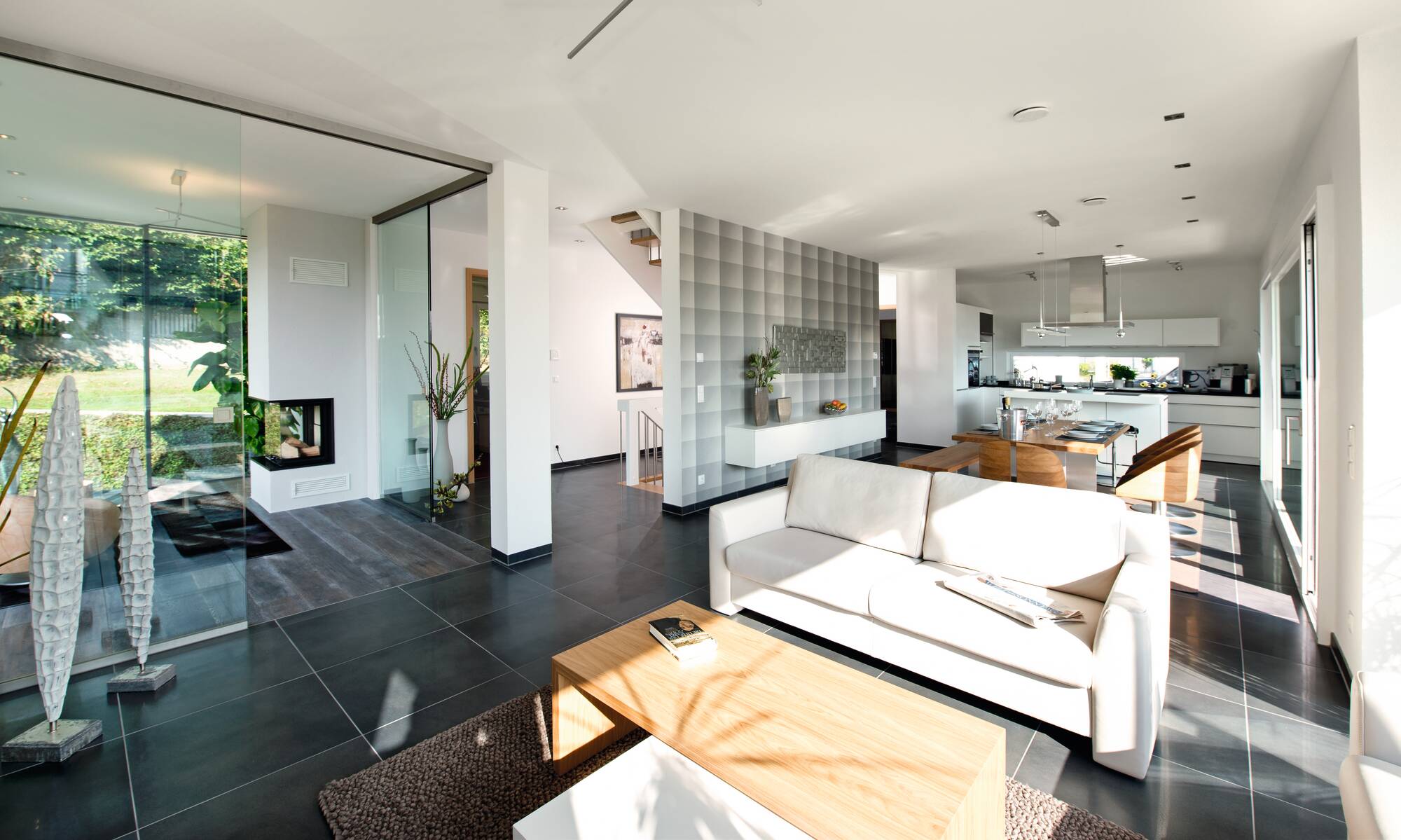 Dans notre nouvelle maison d’exposition à Villingen-Schwenningen, c’est le charme d'une maison individuelle confortable qui se joint à l'élégance d'une maison d’habitation représentative. Le style de la maison d’architecte de WeberHaus conçue individuellement est caractérisé par un design cubique aux lignes droites. La maison convainc par son style moderne et en même Bauhaus classique. Sous le toit plat de cette maison de rêve intemporelle se dissimulent deux niveaux pleins et donc beaucoup d'espace afin de s’y sentir bien, se détendre et vivre heureux. Des cadres de fenêtre gris anthracites contrastent harmonieux avec la façade extérieure au crépi blanc.