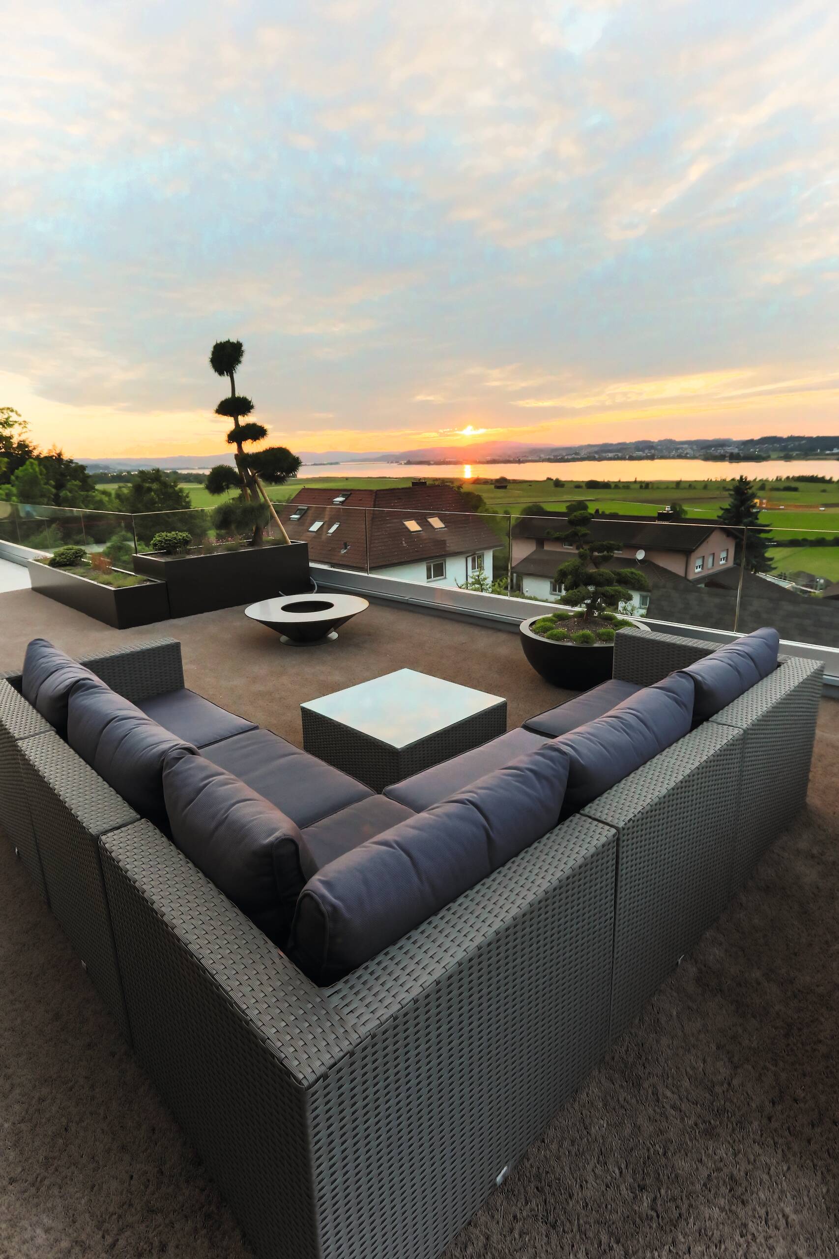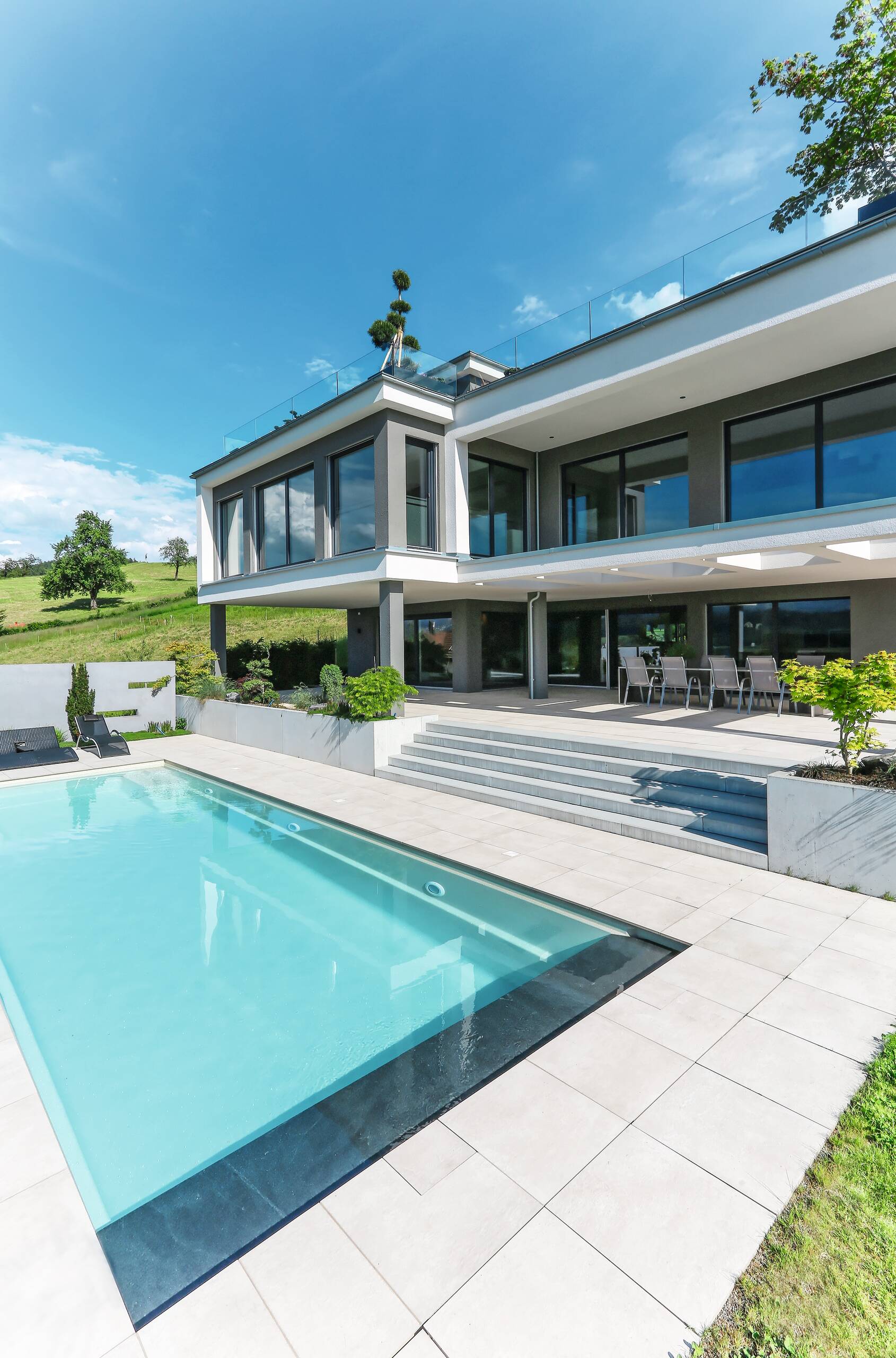 La famille Mercanti a réalisé son rêve d'une maison librement planifiée au langage visuel rectiligne et clair. Le terrain en pente offre une vue impressionnante sur le lac de Zurich alors que la maison sur trois étages répond à tous les désirs. Avec 313 m² de surface habitable, il y a plus qu'assez de place pour les deux filles. Les parents se sont réservé un étage complet pour le sauna, l'espace de repos et l'espace détente - sans oublier le point d'orgue pour tous : la grande piscine. Cette maison suisse au bord du lac est un excellent exemple de la singularité des maisons en ossature bois de WeberHaus.